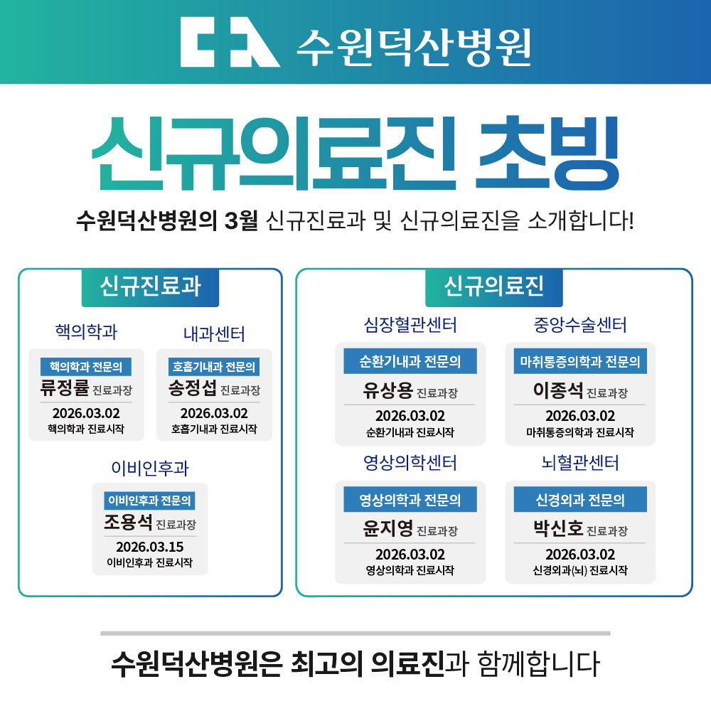 수원덕산병원이 각 진료 분야의 전문 의료진을 새롭게 모시며 진료 역량을 한층 강화했습니다.