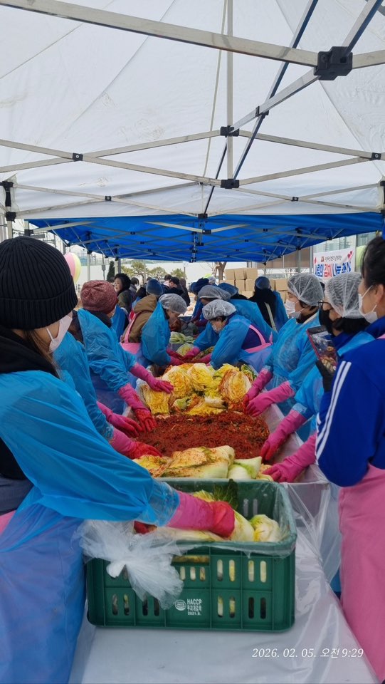 커다란 김치통과 배추 상자, 붉은 양념 냄새가 어우러진 현장은 병원이라기보다 동네 잔칫집을 떠올리게 했다.