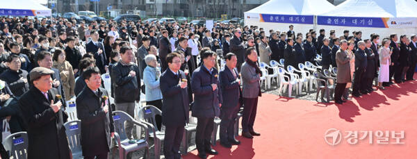 신항철 경기일보 대표이사 회장, 강병직 덕산의료재단 이사장, 이호성 하나은행장 등이 국민의례를 하고 있다.