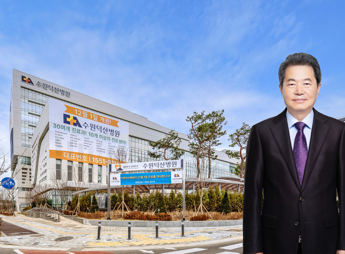 ▲강병직 덕산의료재단 이사장이 지하 4층·지상 9층·연면적 약 10만㎡ 규모의 수원덕산병원 전경을 배경으로 서 있다.